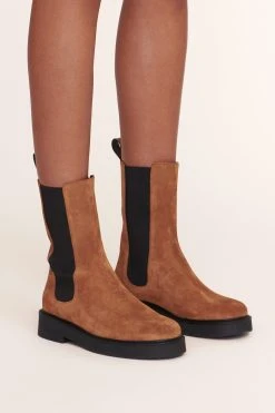 The Aimee is a round-toe suede ankle bootie featuring a block heel and side zipper.
