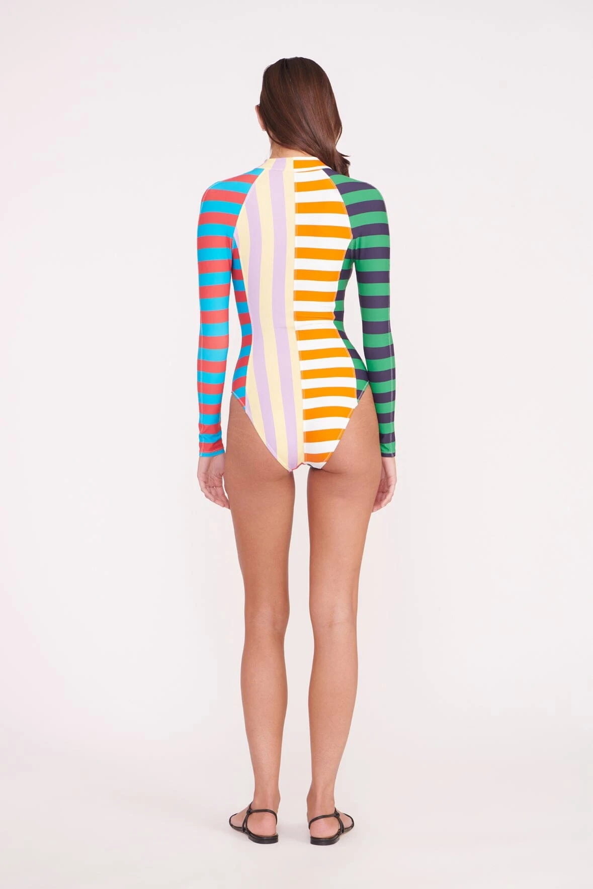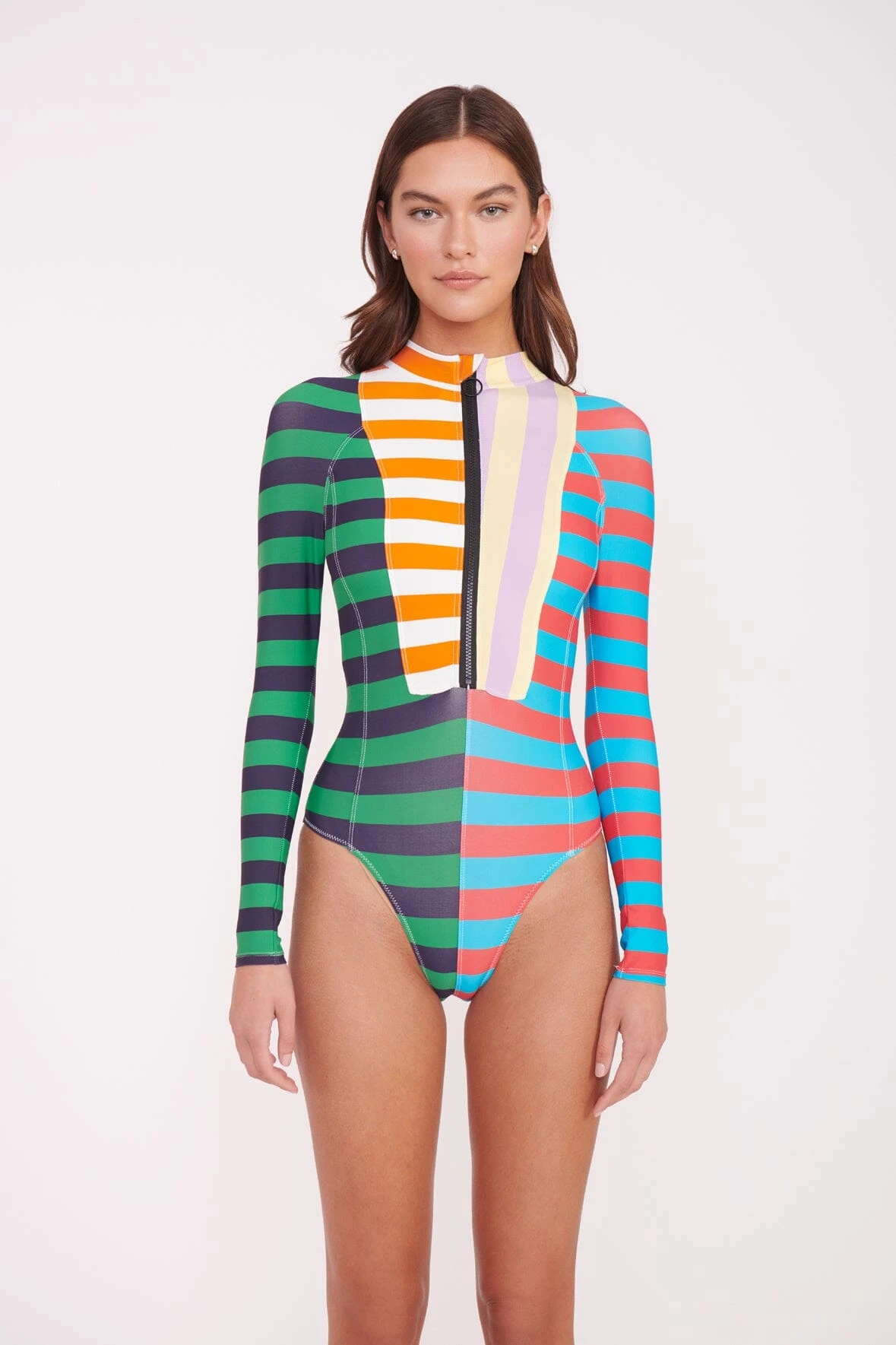 A long sleeve swimsuit fashioned in a rash guard style, the Amalia features contrast stripes and a zip detail down the front.