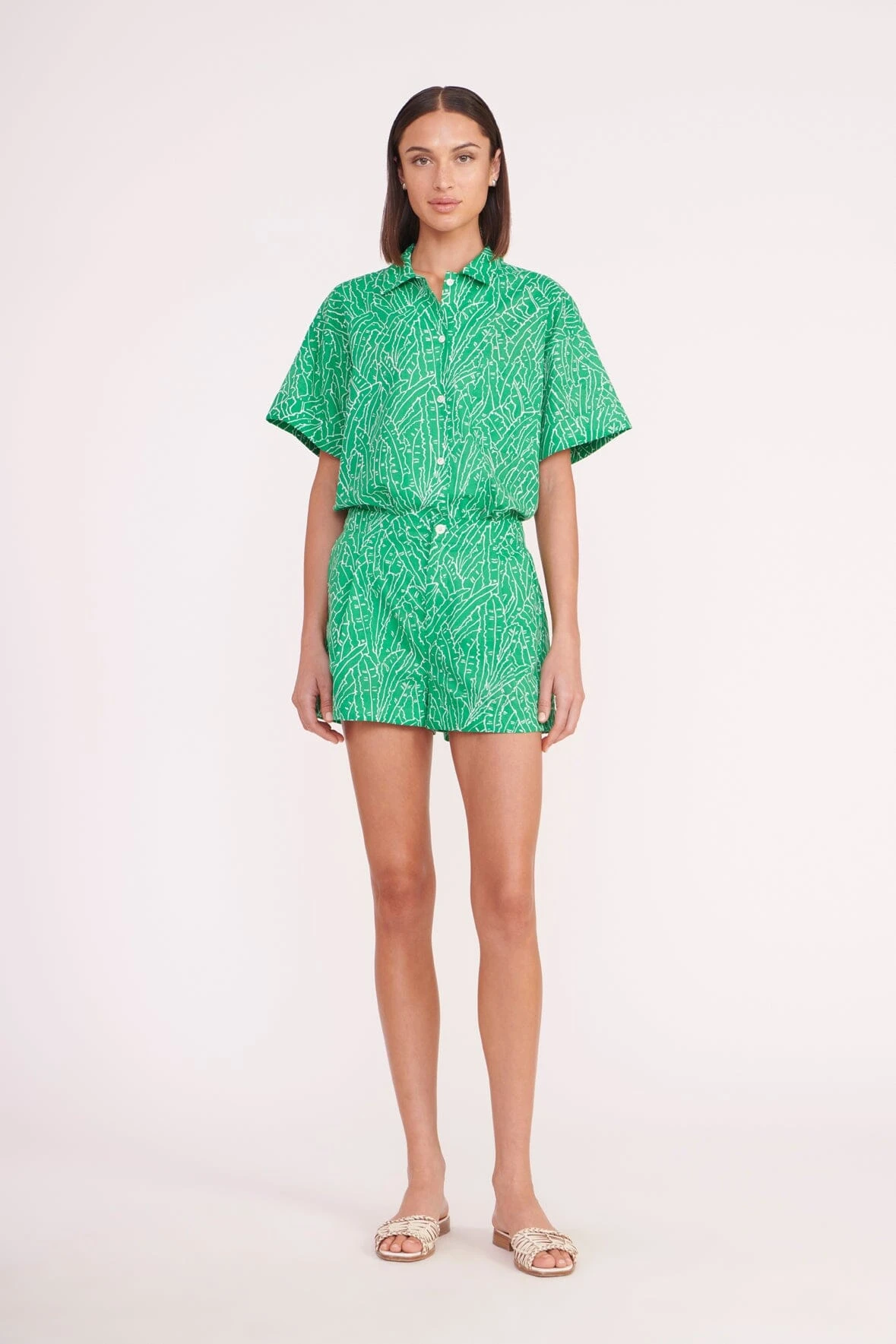 A boxy, short sleeve shirt with palm outlne print. The Channing top features a left patch pocket and completes a coordinating look when paired with the matching Zoey Short.