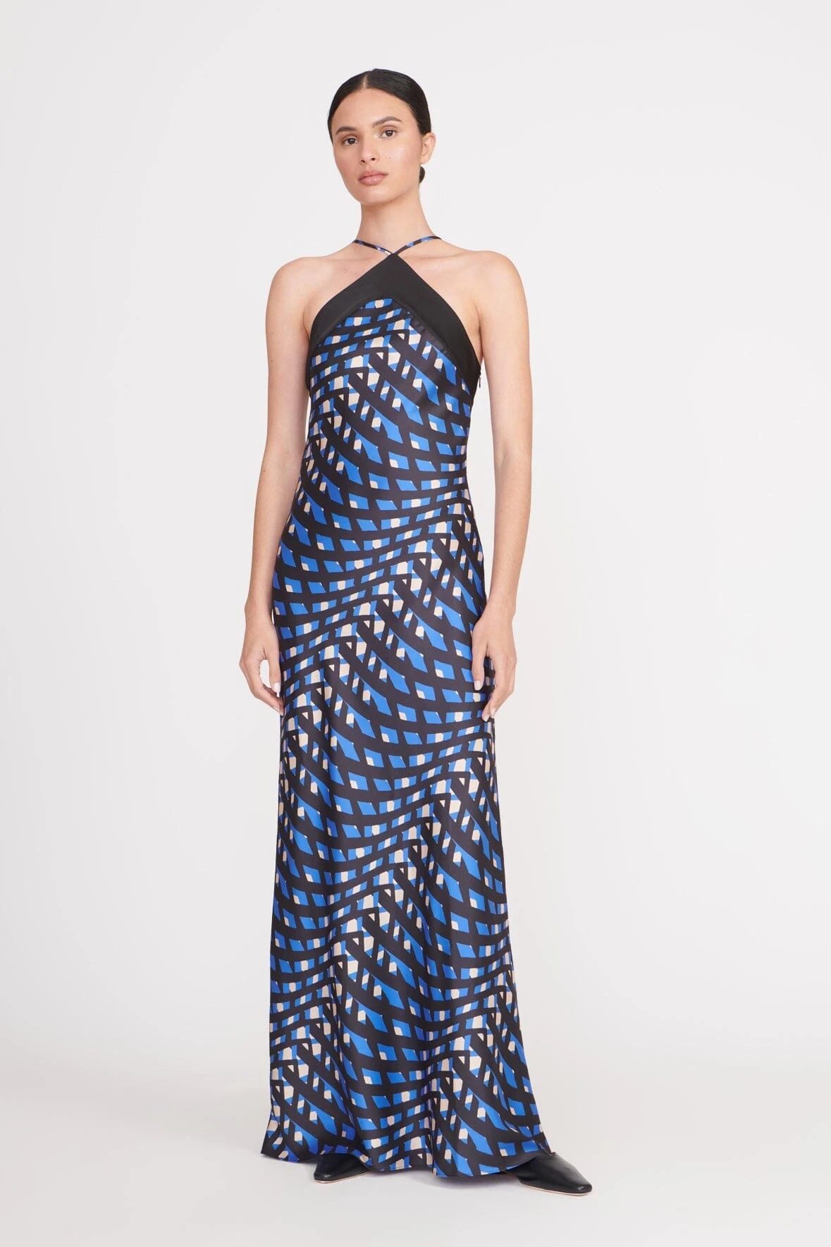 A fitted bias maxi dress in updated in an argyle-inspired abstract pattern. The Cubism Dress features a halter neckline and adjustable crossover straps at the back.