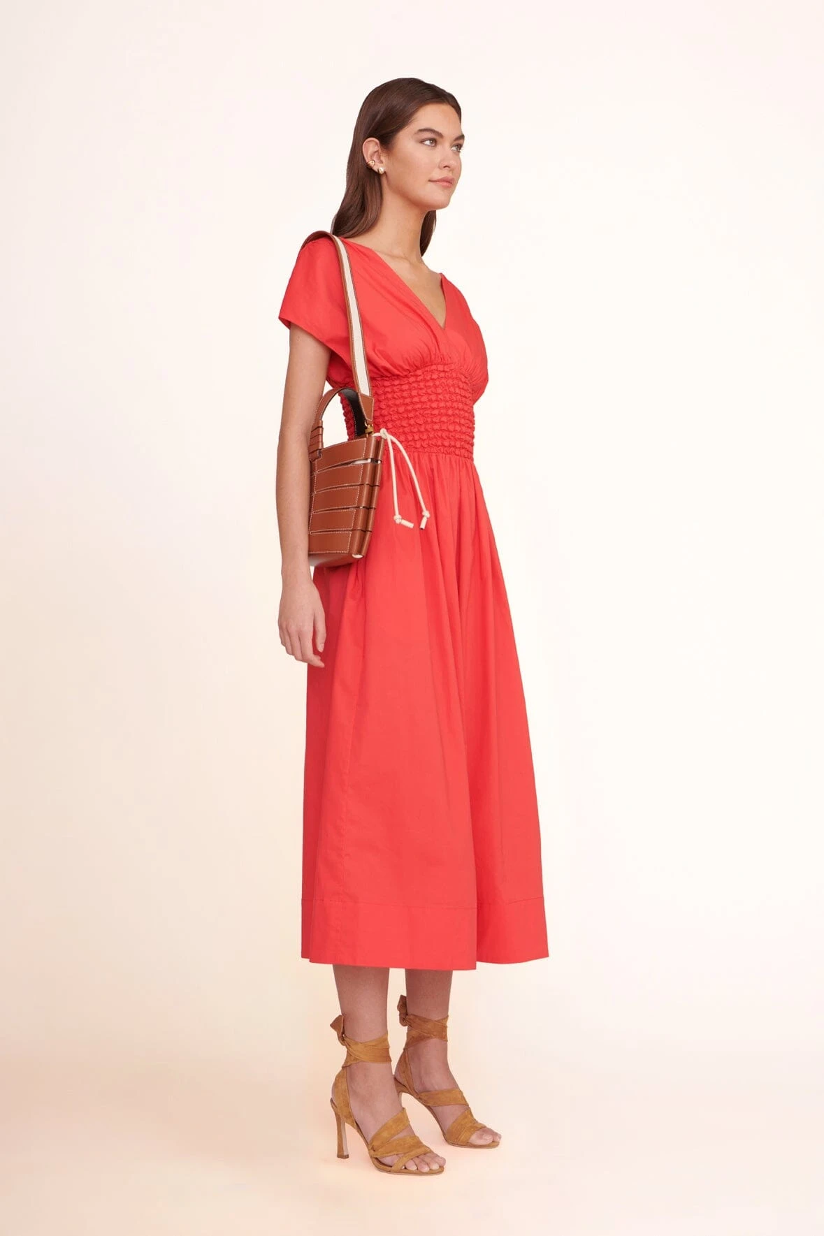 The Mini Diamond Tote features a slatted leather construction with natural cotton decorative cords and a removable canvas drawstring pouch with interior pocket.