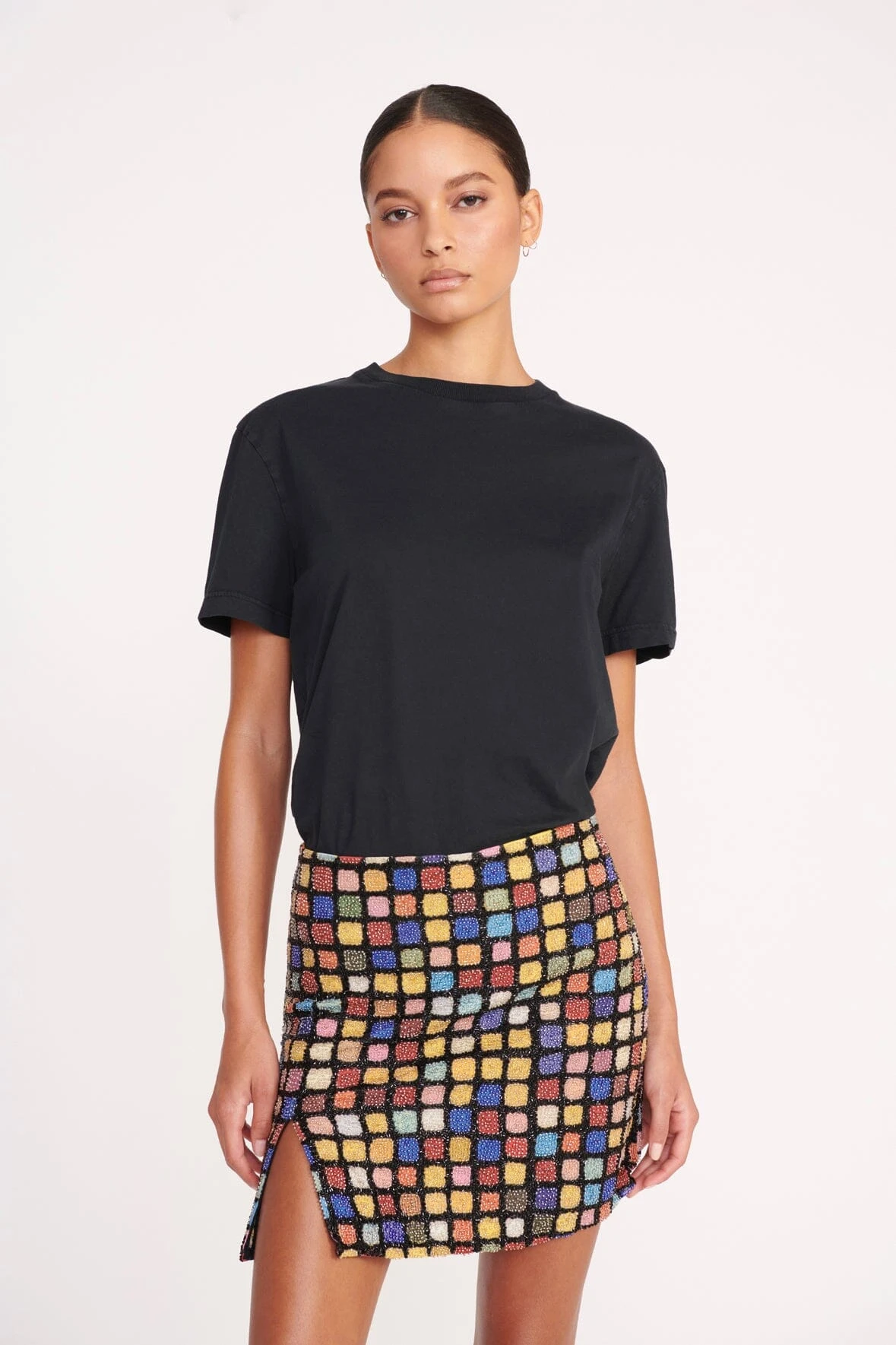 A hand-beaded mini skirt in a festive dance floor-inspired mosaic pattern. The Emerie Skirt features a thigh slit and a hidden zipper.