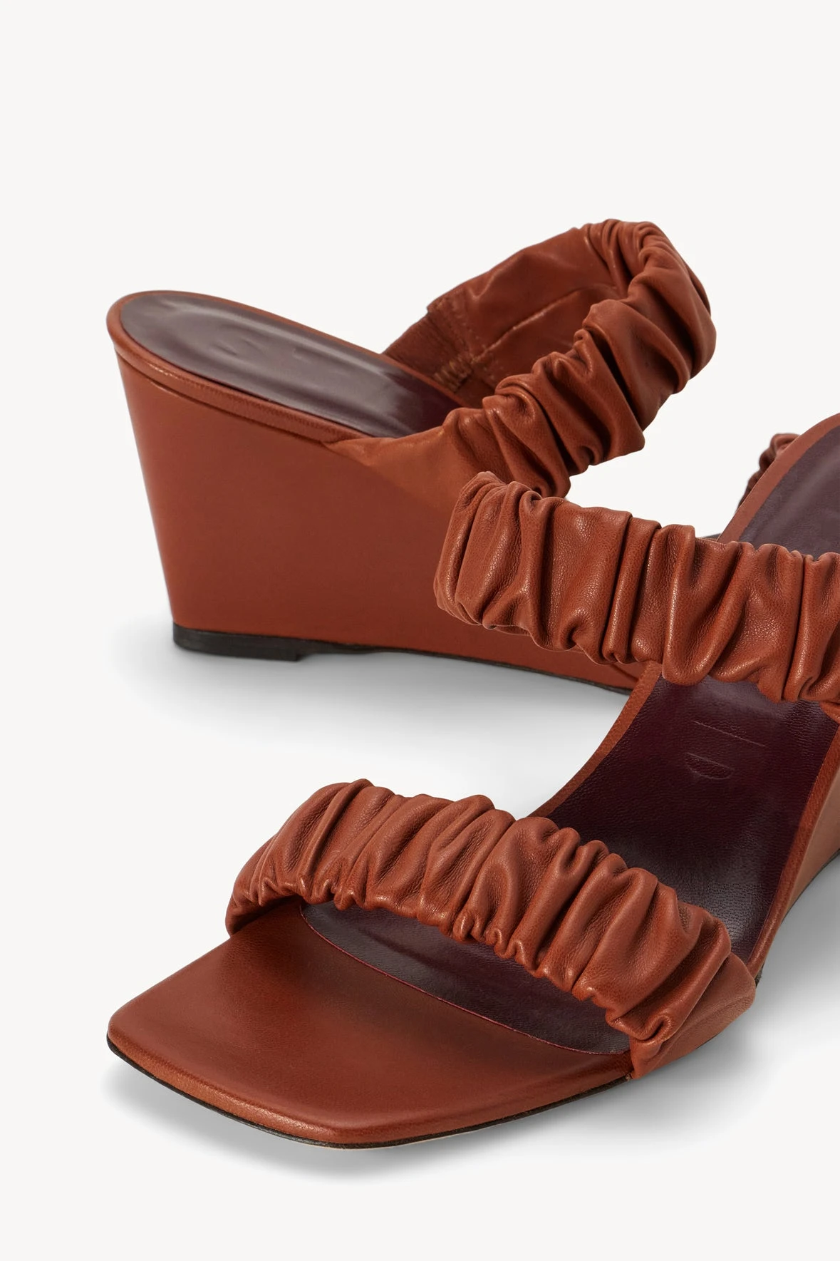 An update to our signature heel, the Frankie Wedge features a square toe and two ruched leather straps.