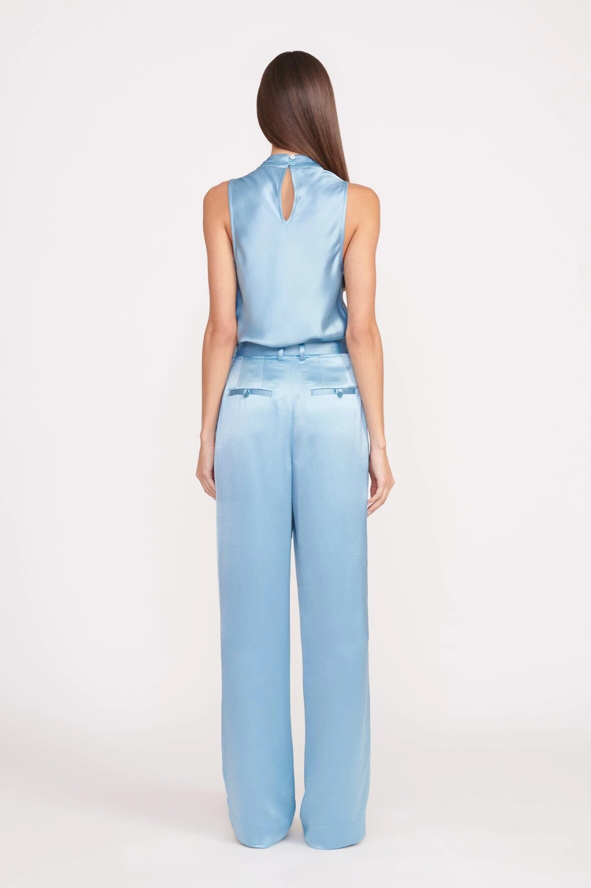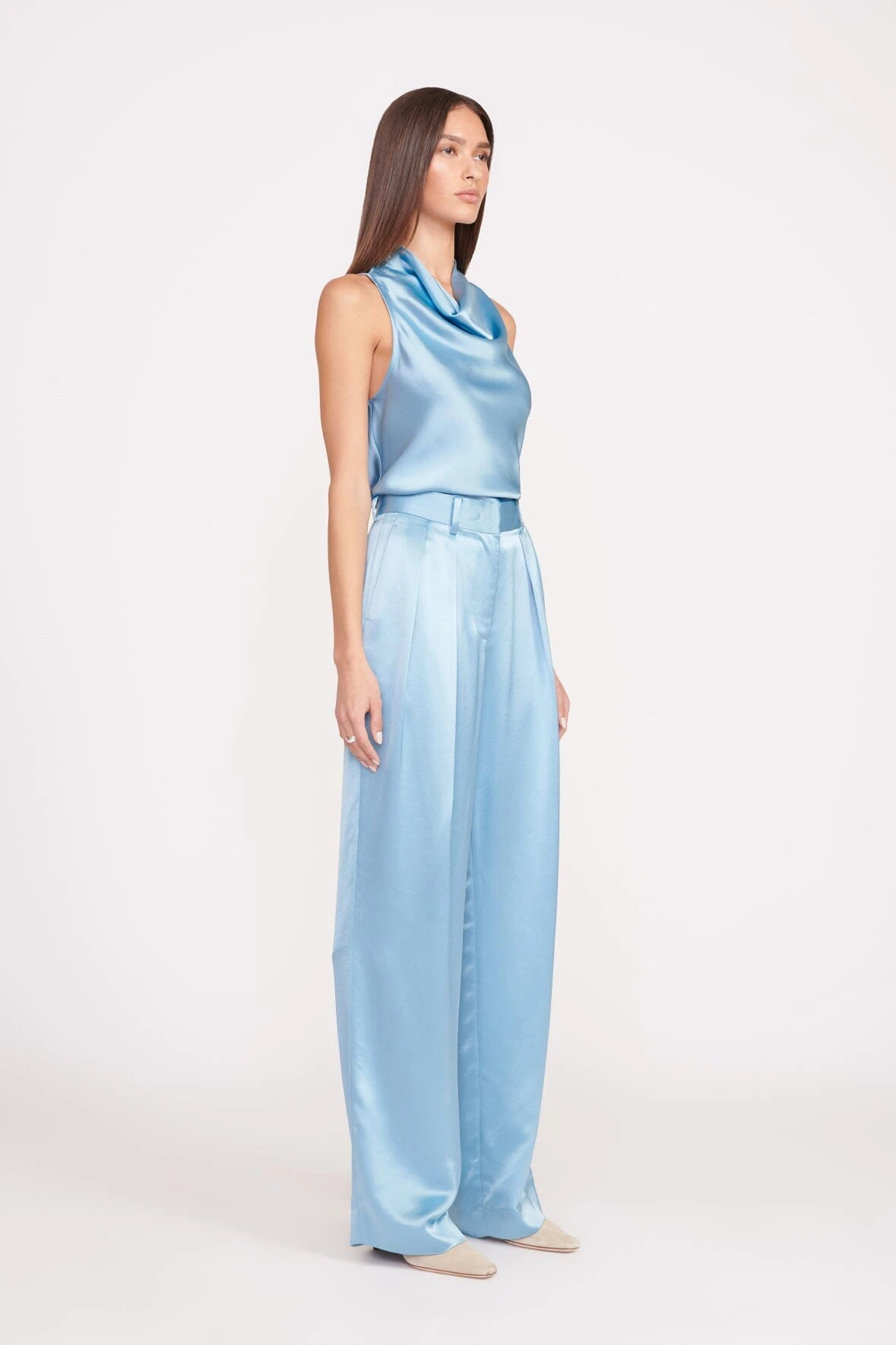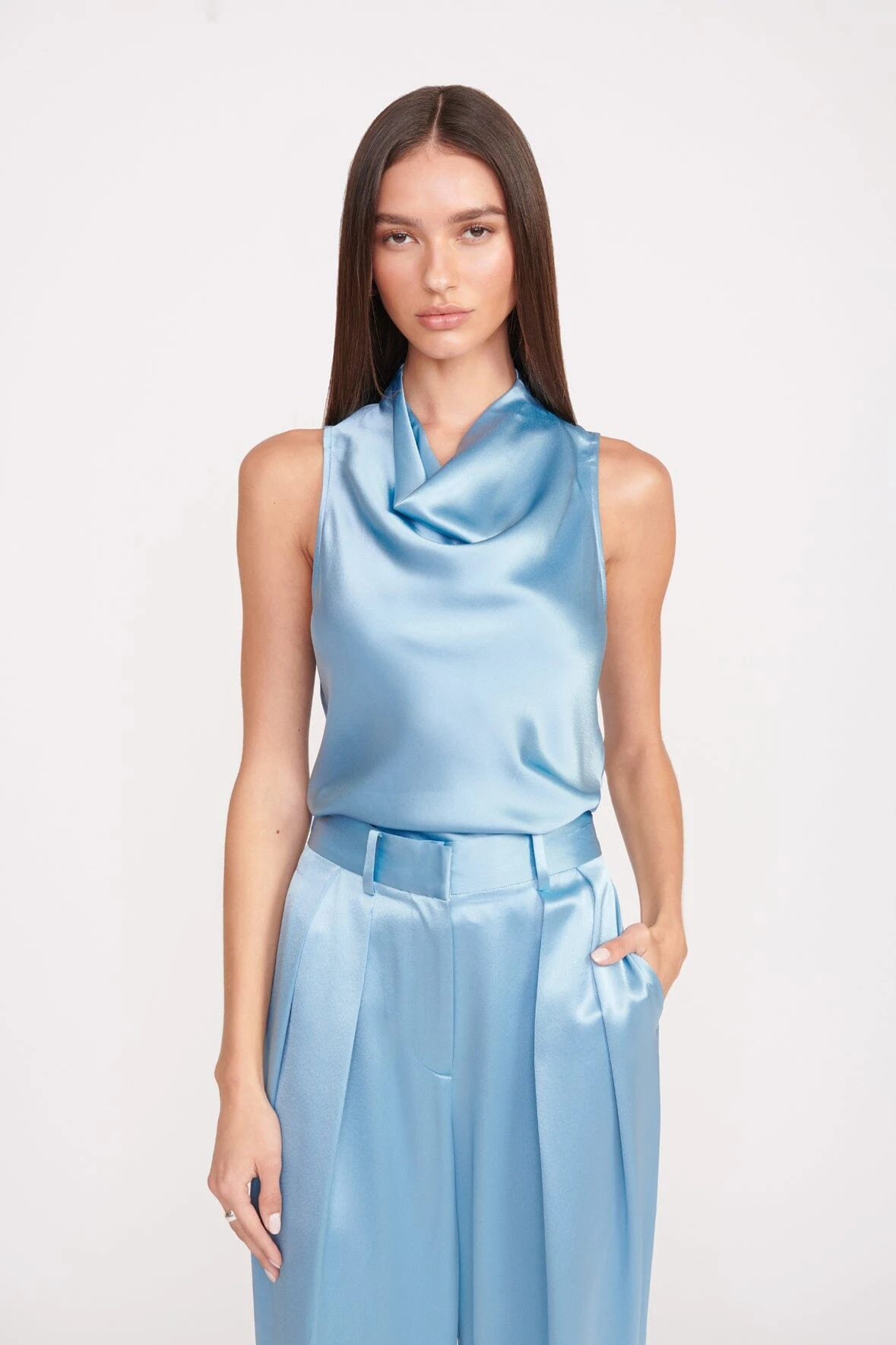The Gesture Top is a satin cowl neck sleeveless top that pairs perfectly with our Satin Luisa Pant for a full satin look. This style features a keyhole at the back and a button closure.Â