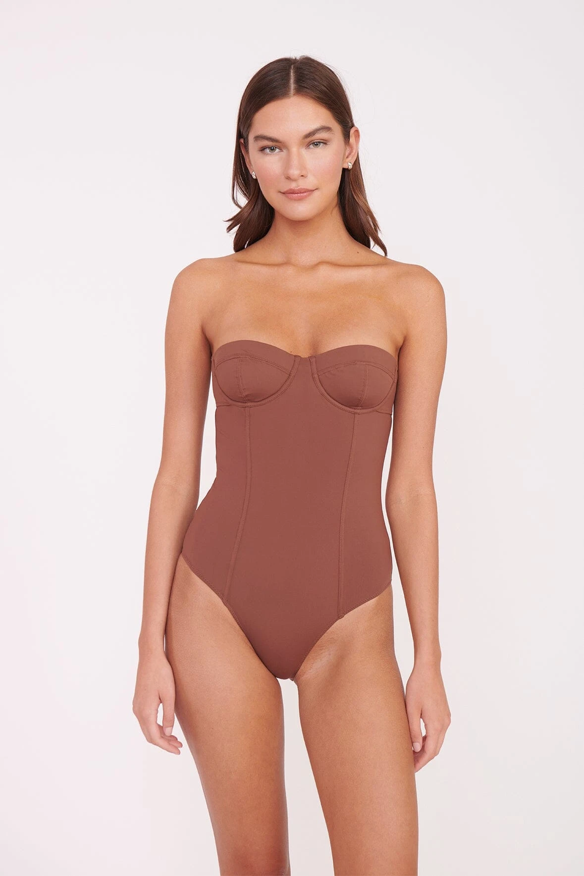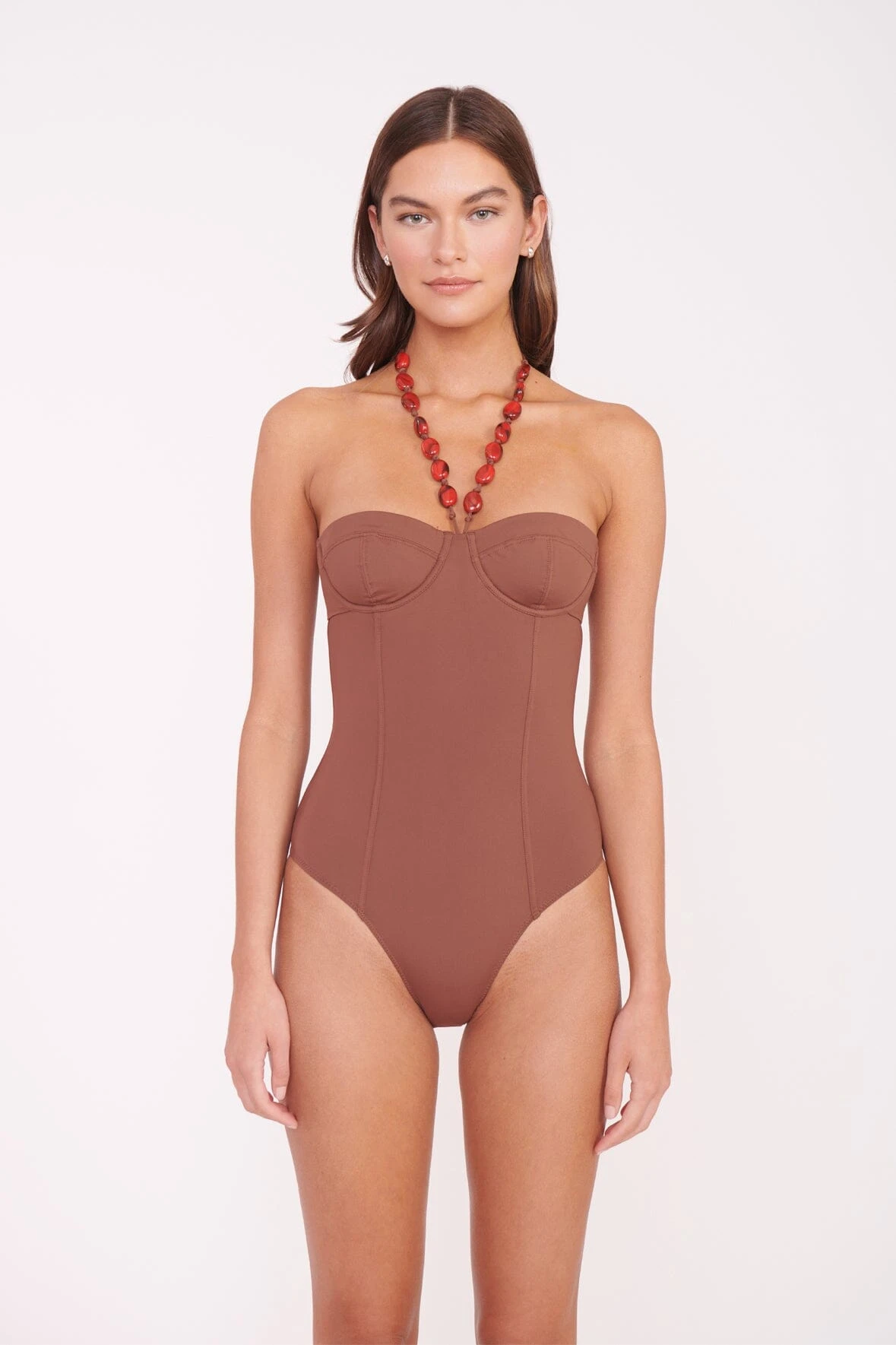 A convertible one-piece swimsuit, the Harper is a sleek one-piece featuring a removable beaded halter strap, moderate back coverage, and a low back with clasp closure.
