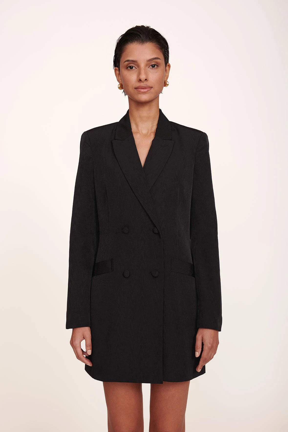 An oversized, boxy double breasted blazer made out of a woodgrain-embossed moire fabric. Wear on its own as a dress or over pants.
