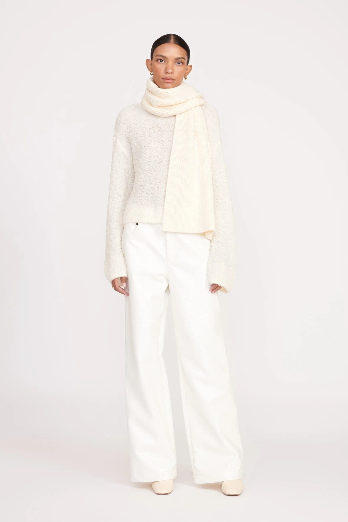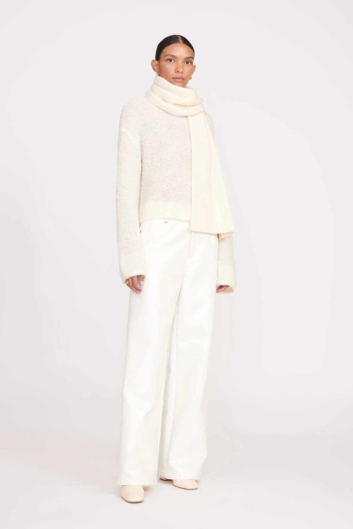 Our Knit Scarf is crafted in soft merino wool for easy Fall layering under the Carver Coat and atop a sweater.