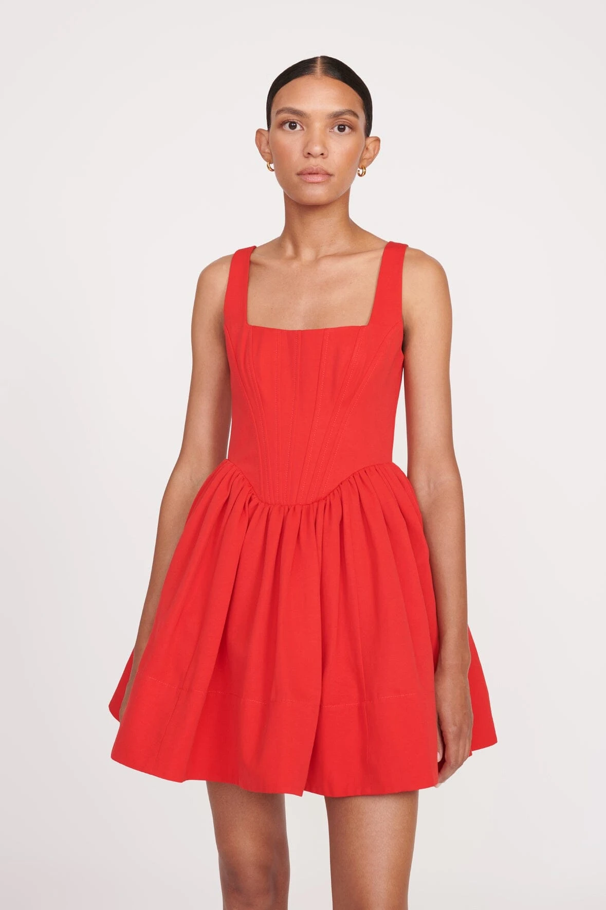 A sleeveless mini dress, this style features a full skirt and corset bodice fashioned after our signature Alice Top.