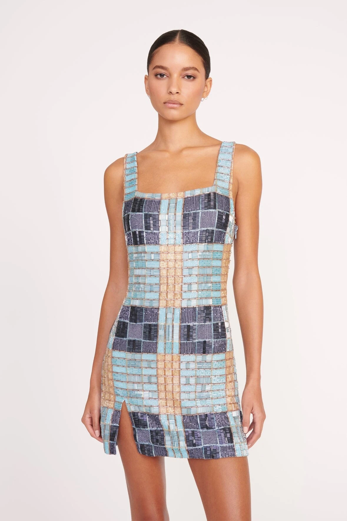 A slightly stretchy, fully hand-beaded mini dress, the Le Sable features an all over plaid pattern and right leg slit.Â