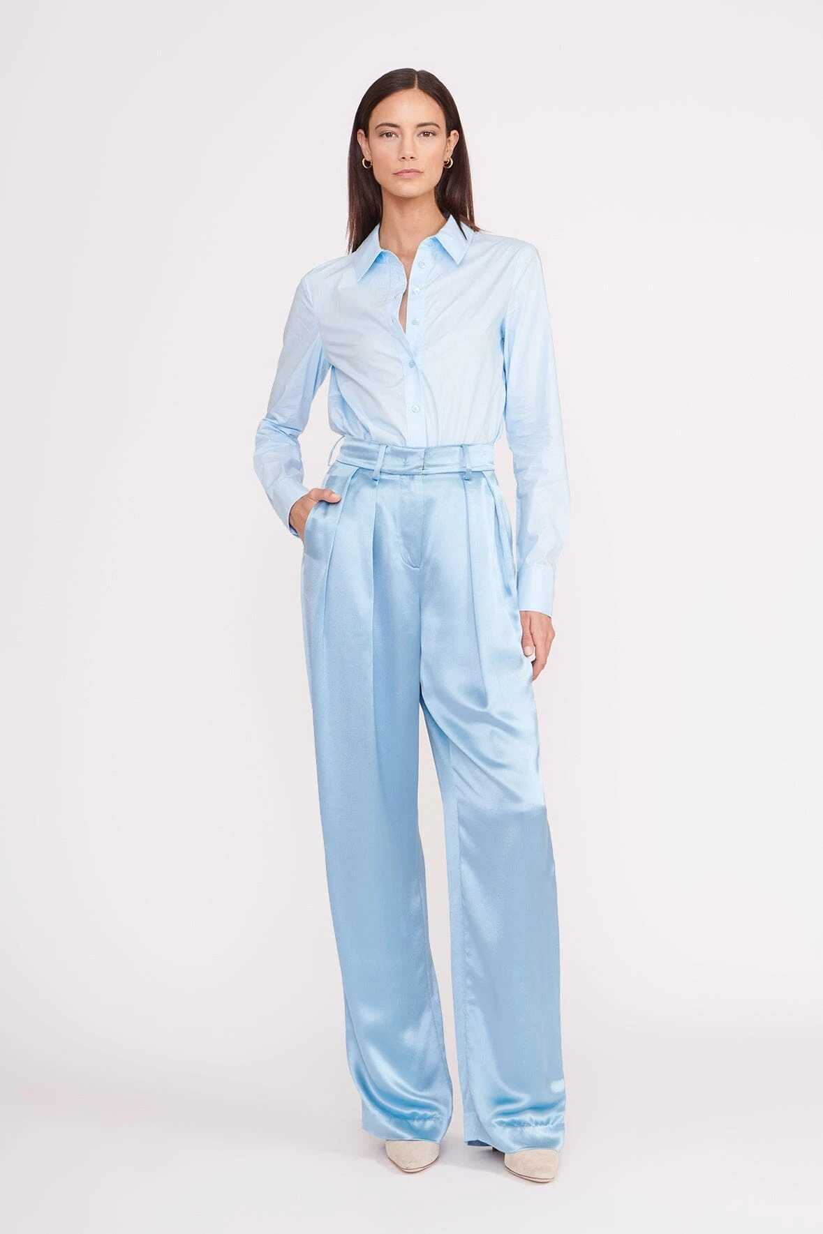 Our signature pant updated in a shiny satin fabric. The Luisa is a wide leg pleated trouser with hook and zip closure.Â