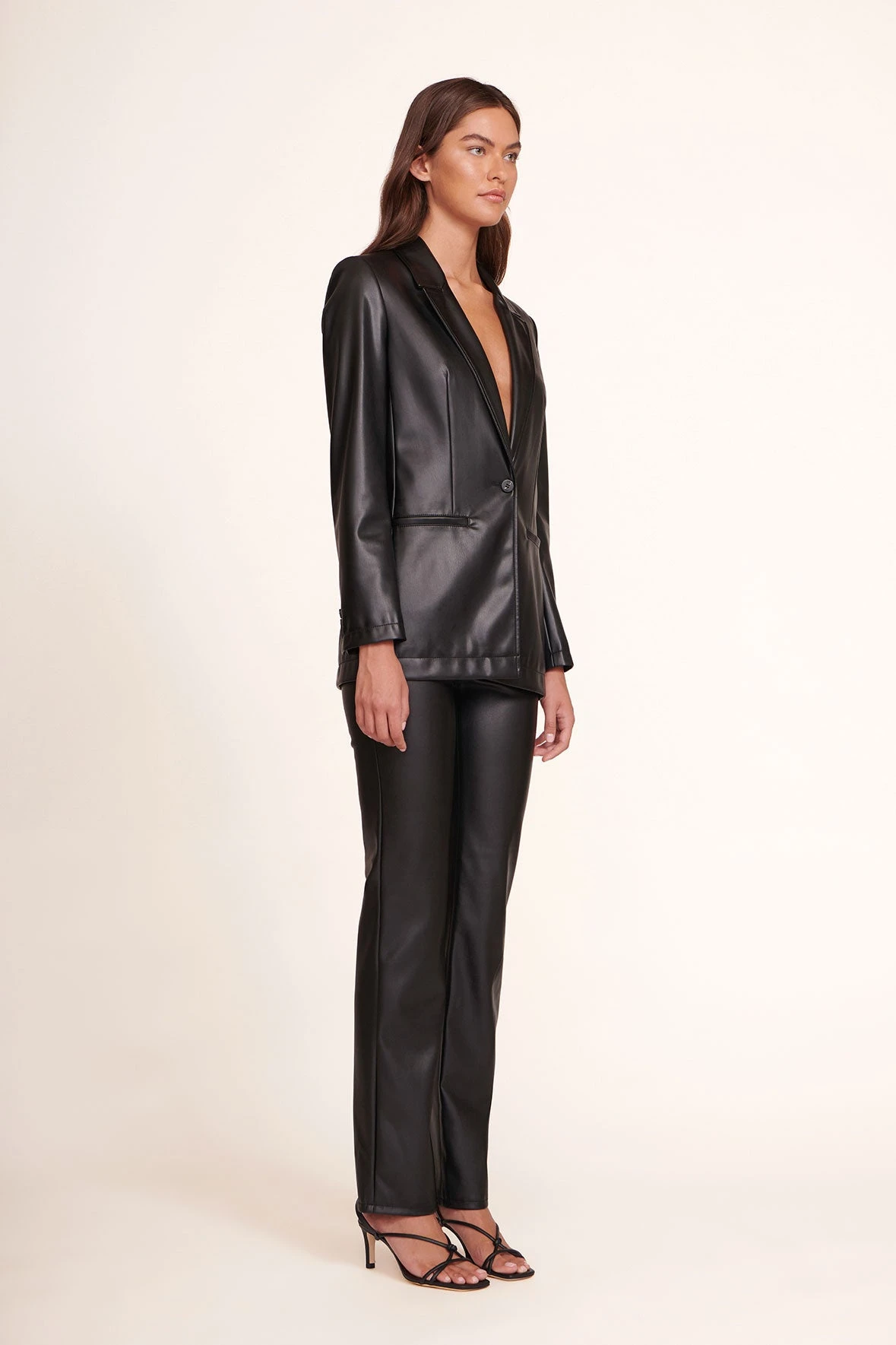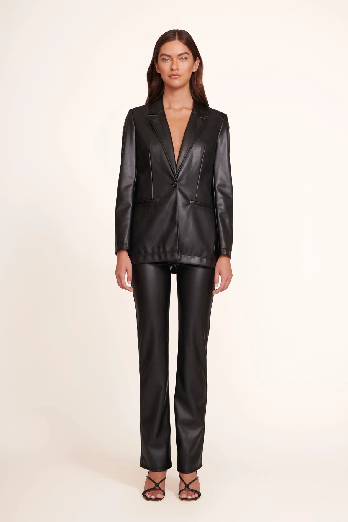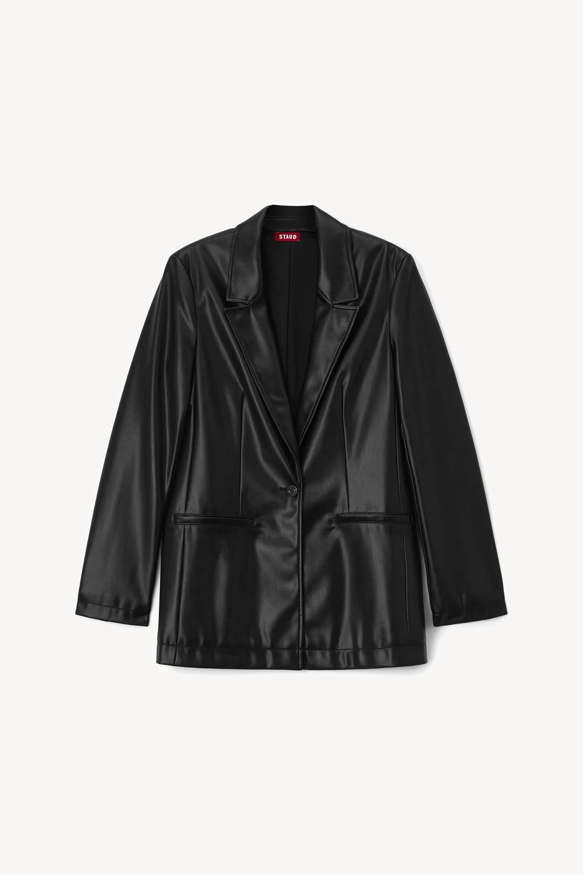 The Vegan Leather Madden Blazer features two front hip pockets with a single button closure.