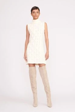 A mini sweater dress in a honeycomb cable knit, the Mod Dress is the perfect dress to layer under a coat with knee-high boots. The Mod Dress features a turtleneck and a sleeveless body.Â