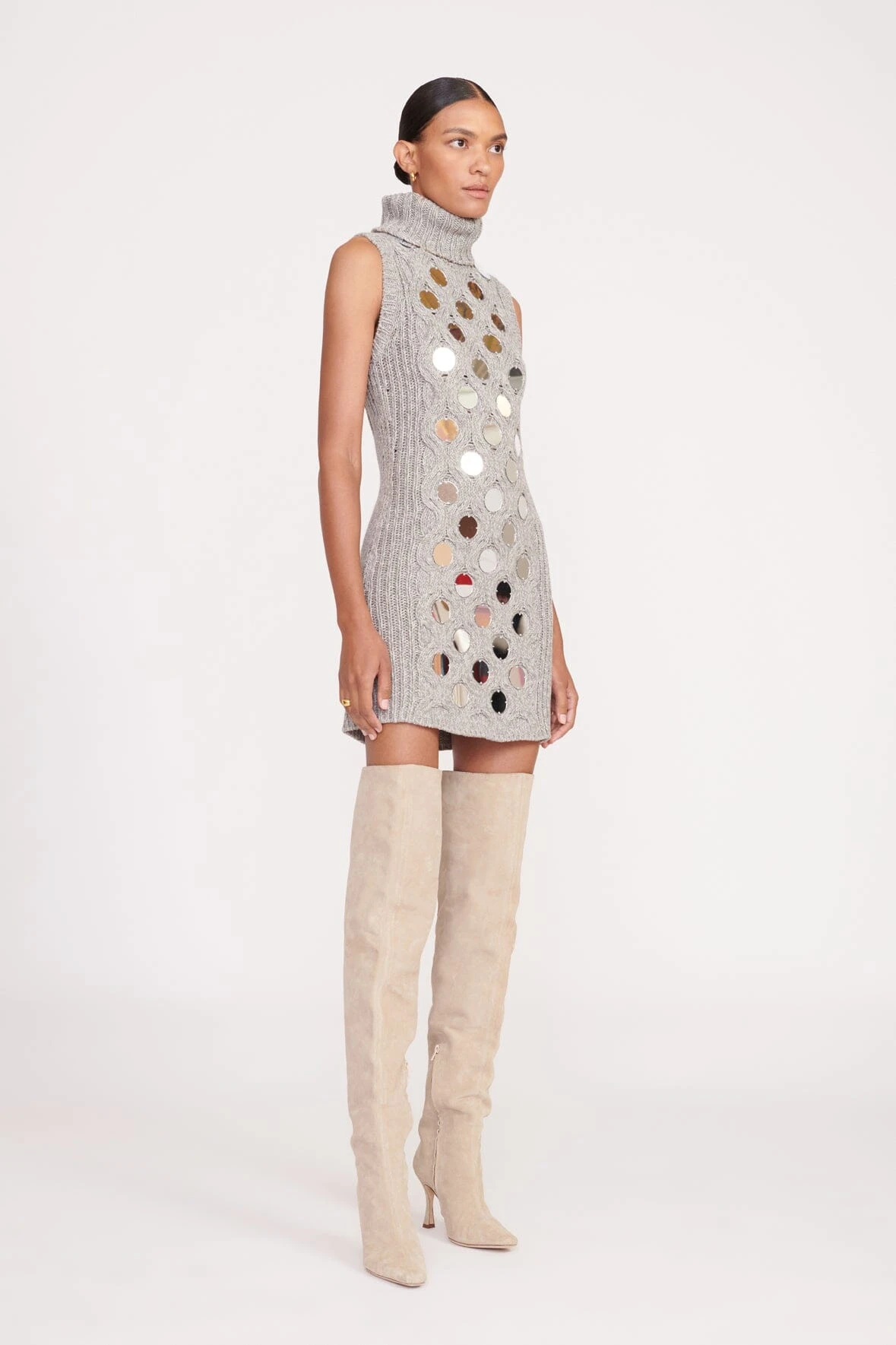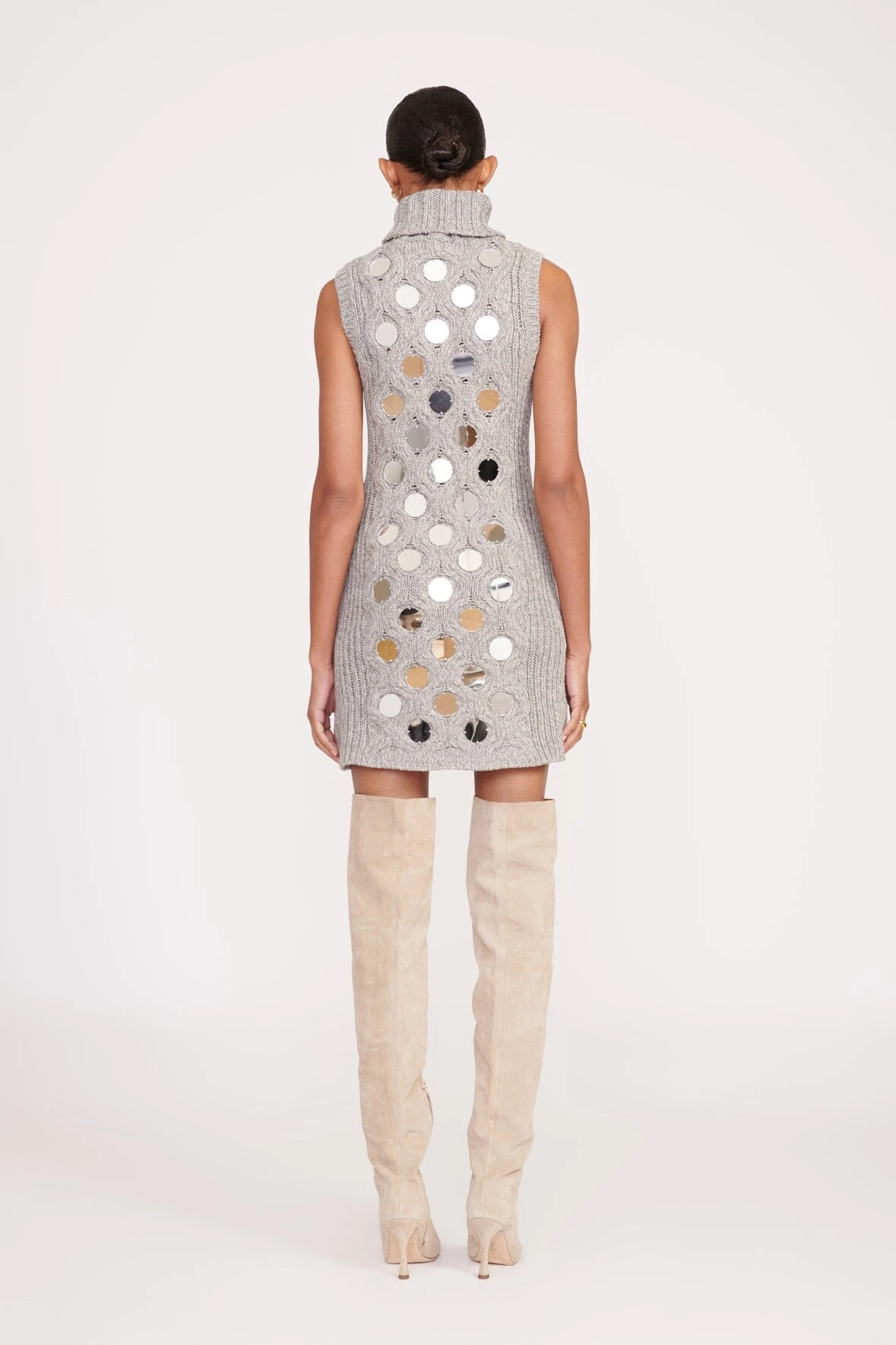 A mini sweater dress in a honeycomb cable knit with mirrored paillettes, the Mod Dress is the perfect dress to layer under a coat with knee-high boots. The Mod Dress features a turtleneck and a sleeveless body.
