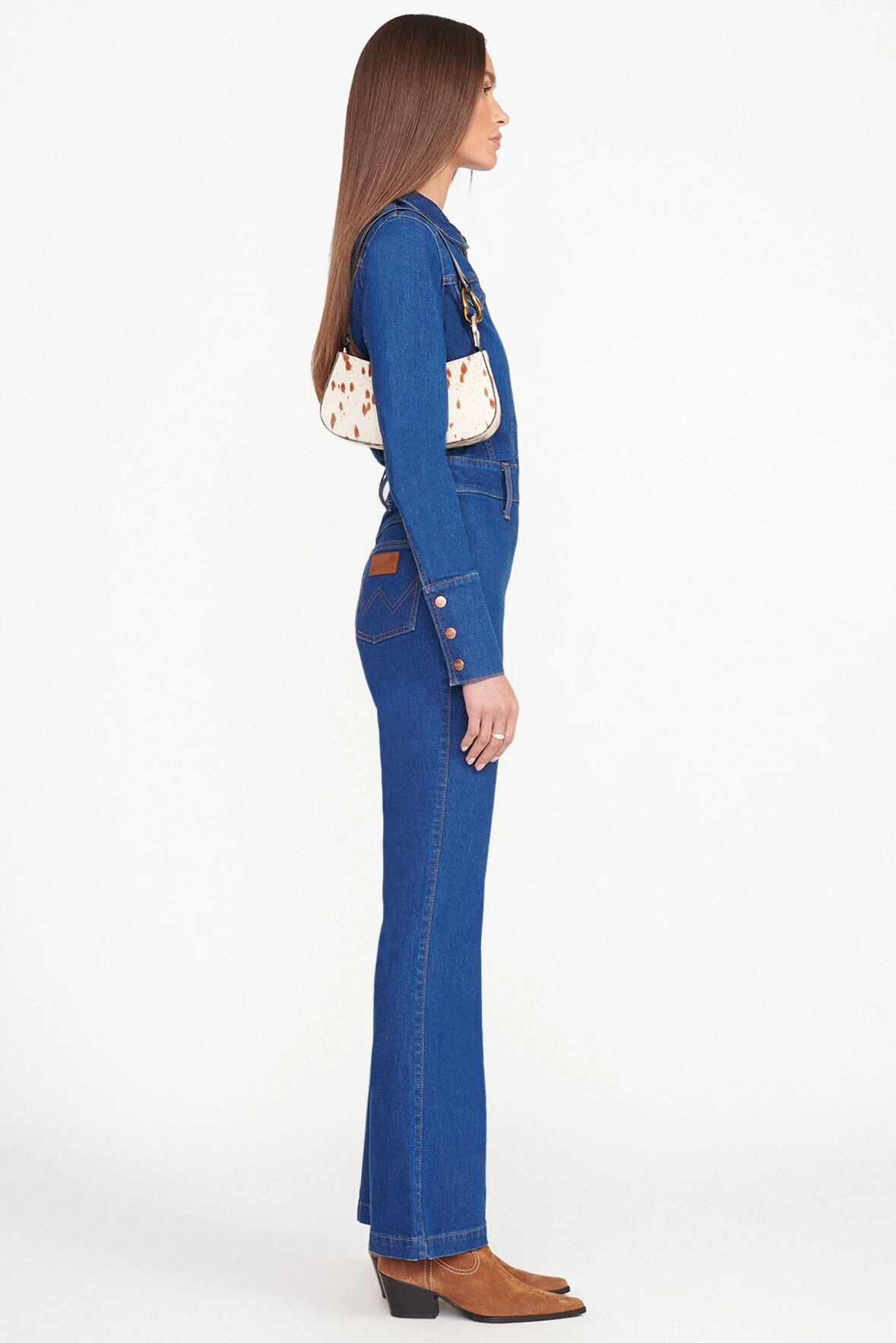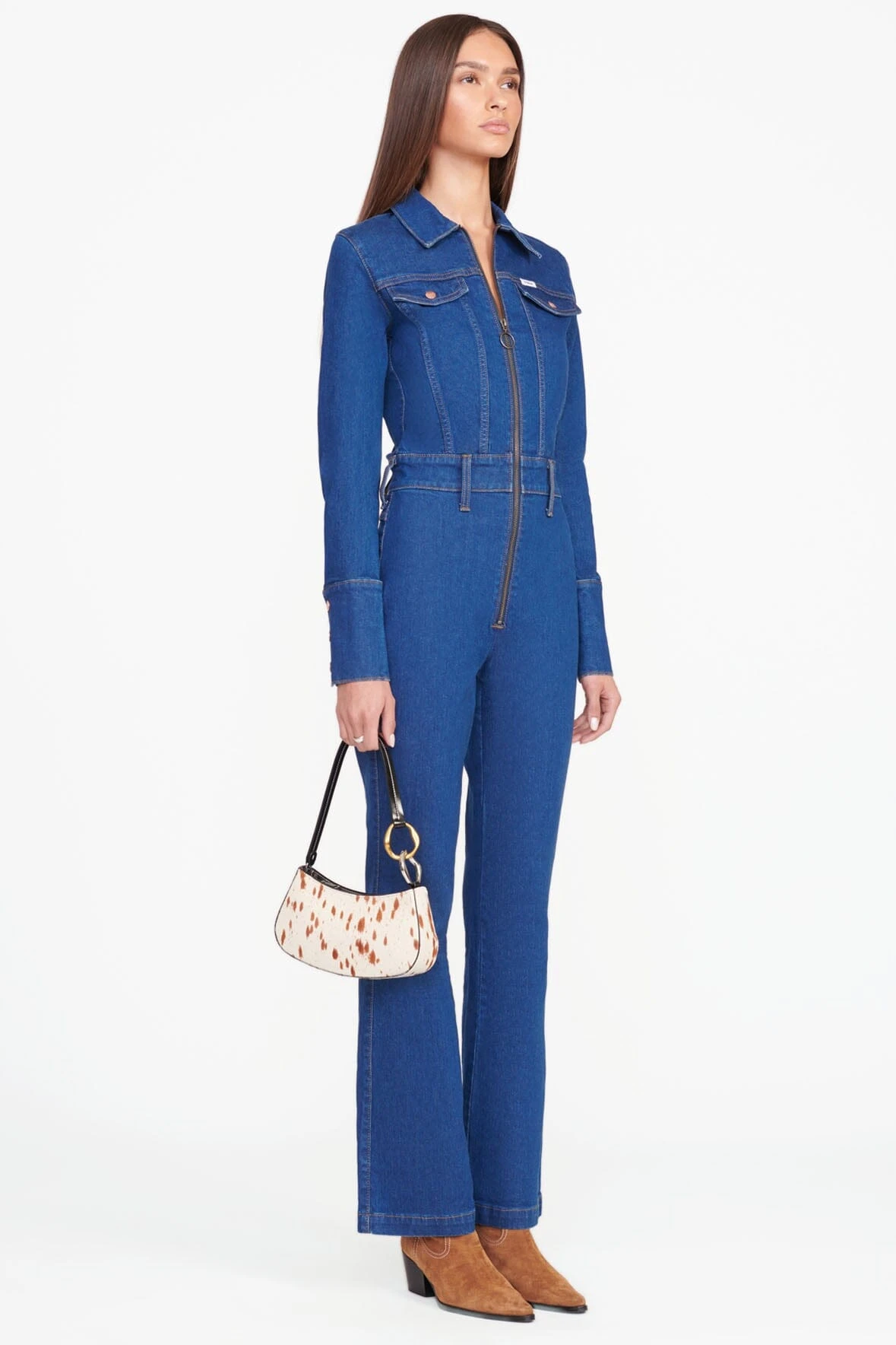 The Ollie Bag is a mini shoulder bag made out of haircalf. This style features a hardware design on the strap and a zip closure.