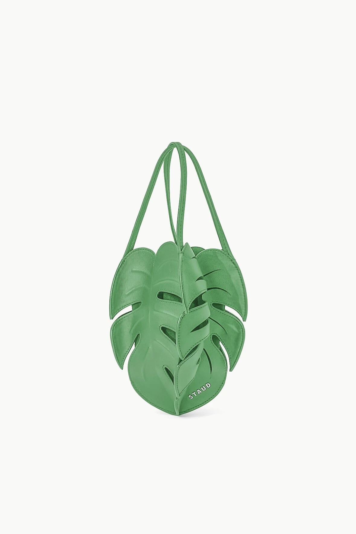 A handheld leather bag constructed of four leaf-shaped panels. The Palm Bag features two handheld straps and a magnetic closure.