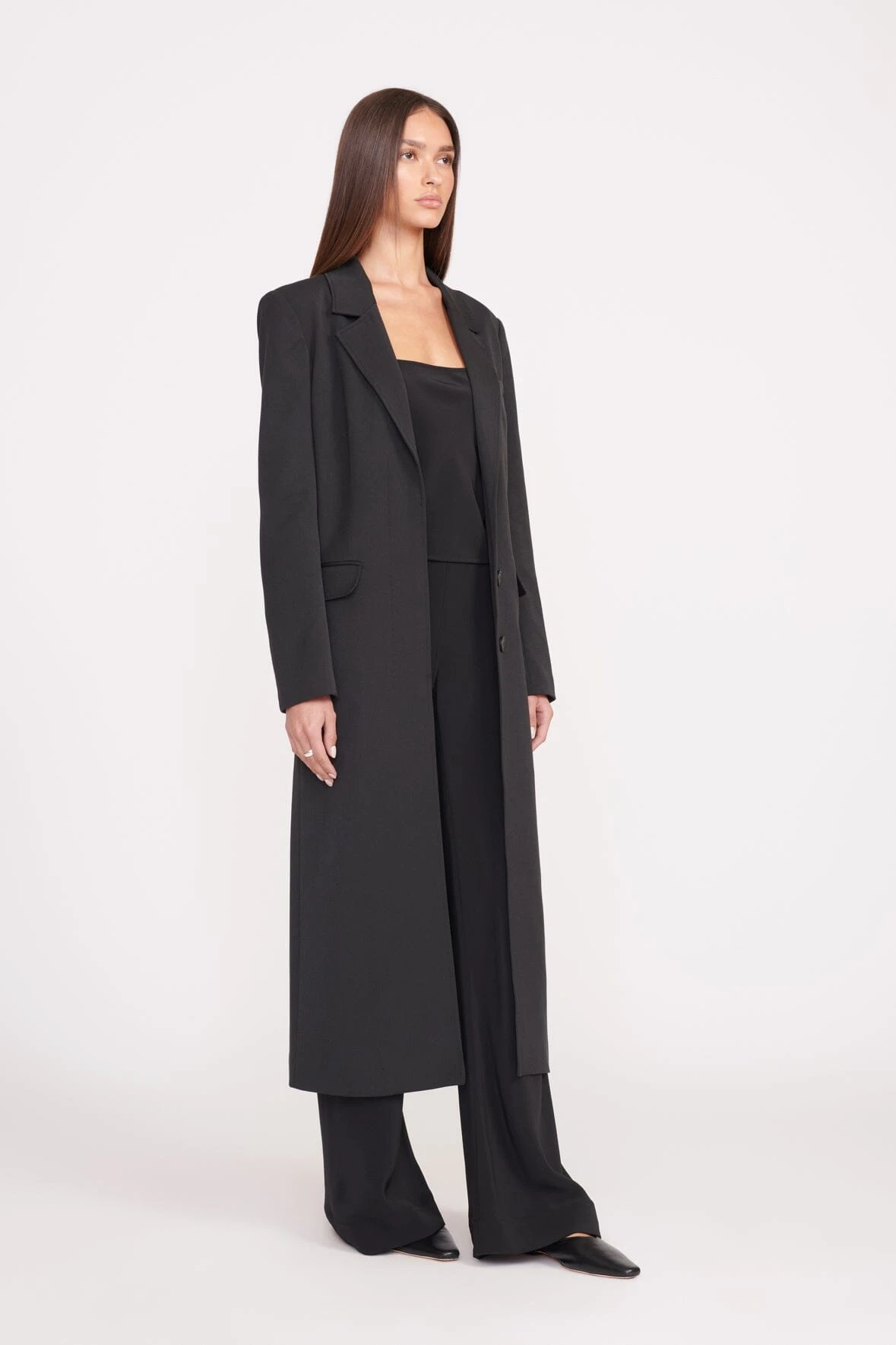 Essential for layering, this single-breasted, longline suiting coat is perfect for any occasion. Subtle details such as flap pockets and a back vent give it a timeless appeal.