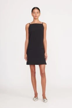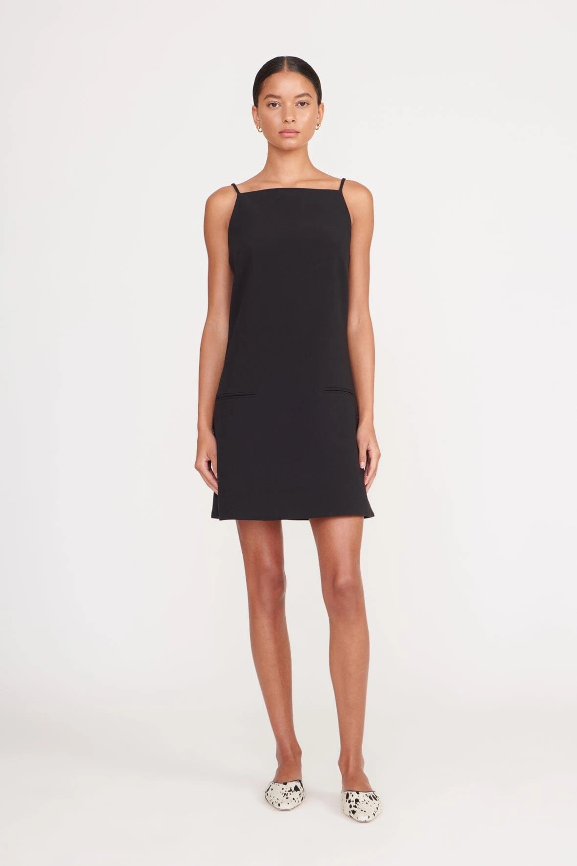 A tailored mini dress with relaxed silhouette, this style features double welt pocket details at the front and a square neckline.