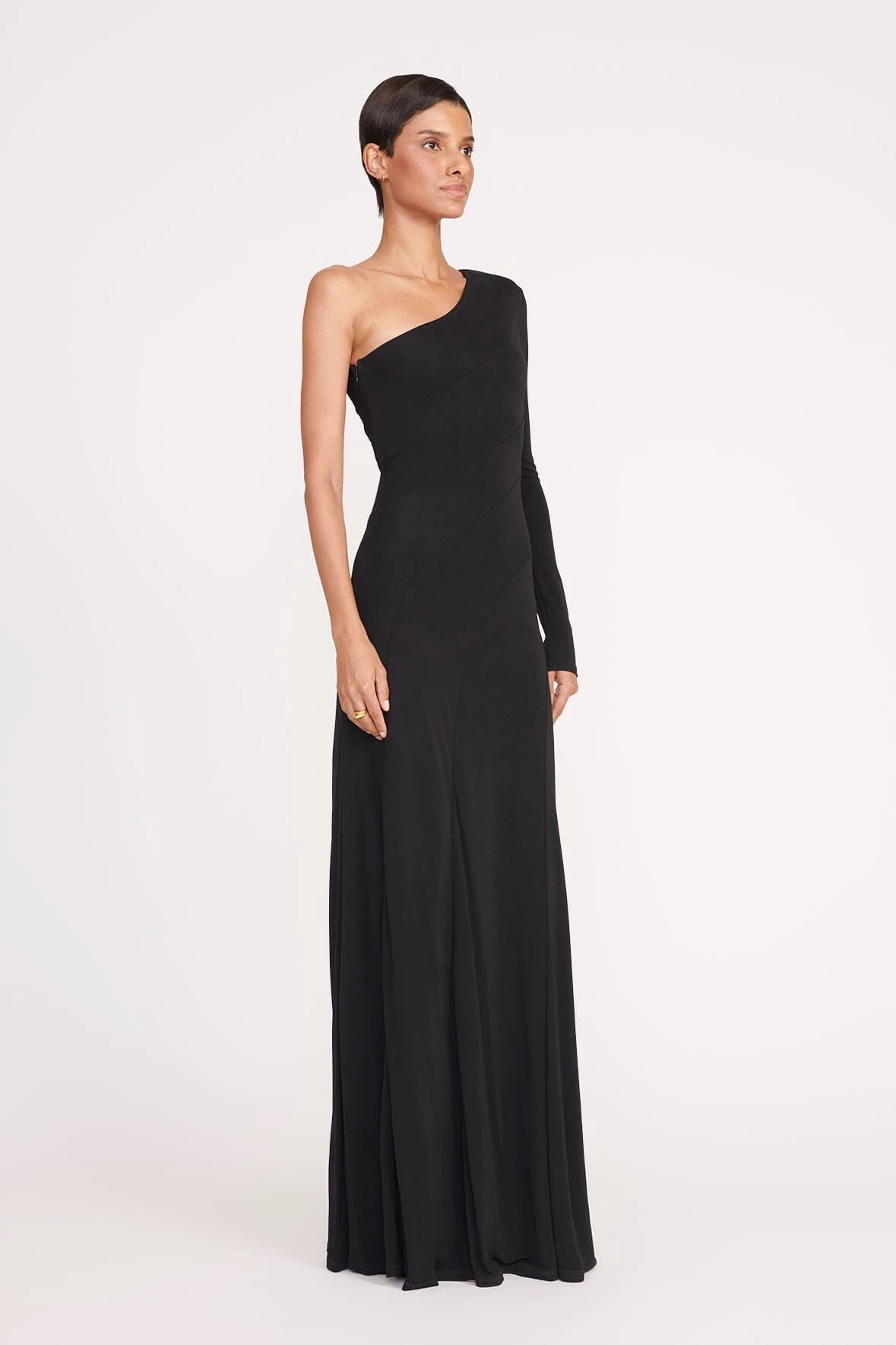 The Serena Dress is a one-shoulder maxi dress with asymmetrical seams throughout the body for a sleek and flattering look. This style is made out of a slinky jersey fabric and features a side zipper.