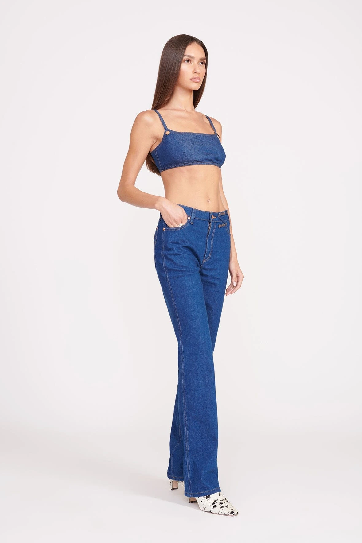 The STAUD Straight Cut Jean is our new closet staple, in a comfortable, everyday fit. This mid-rise jean sits just below the natural waist and has a straight fit throughout the leg. This style is available in 2 inseam lengths and features our STAUD belt loop detail at the waist.Â