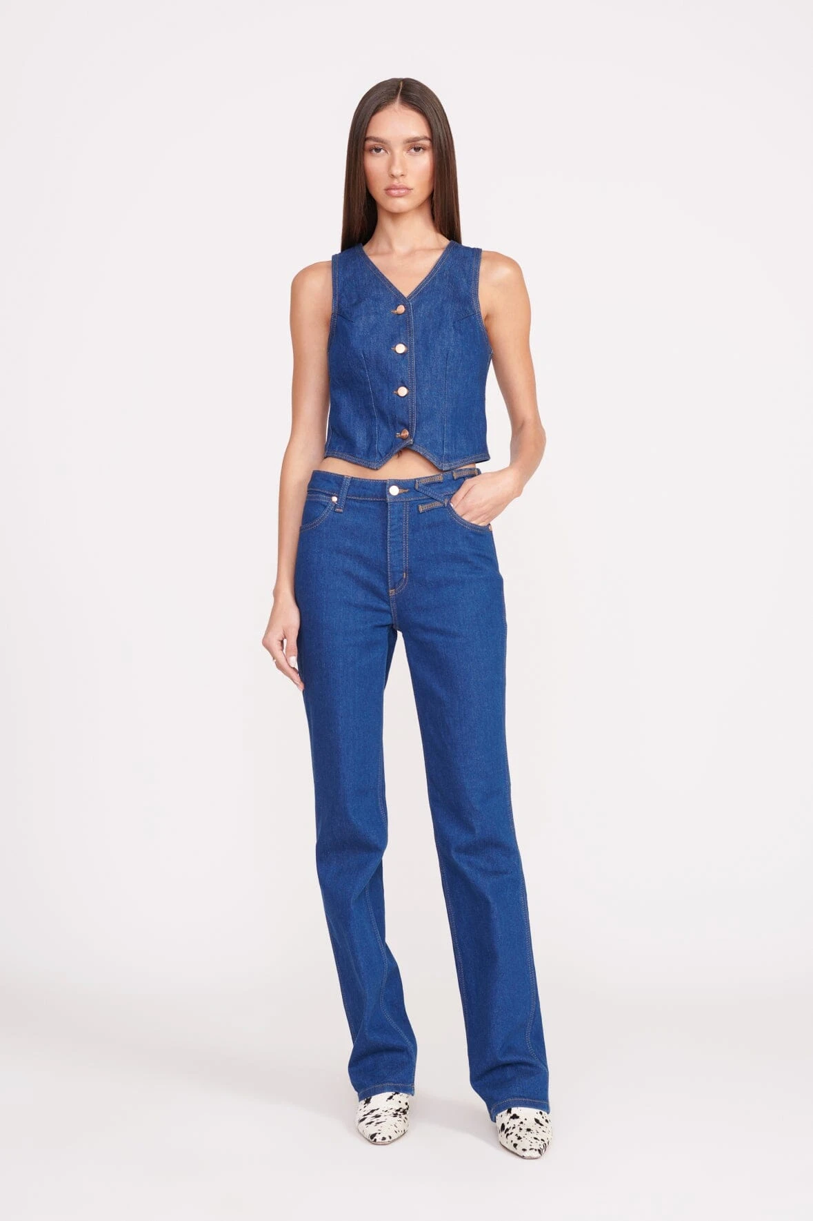 The Vest is our fitted, cropped denim vest meant to pair back perfectly with any STAUD + Wrangler jeans. Available in two washes, this style features button detailing and adjustable tab at the back to cinch in the waist.Â