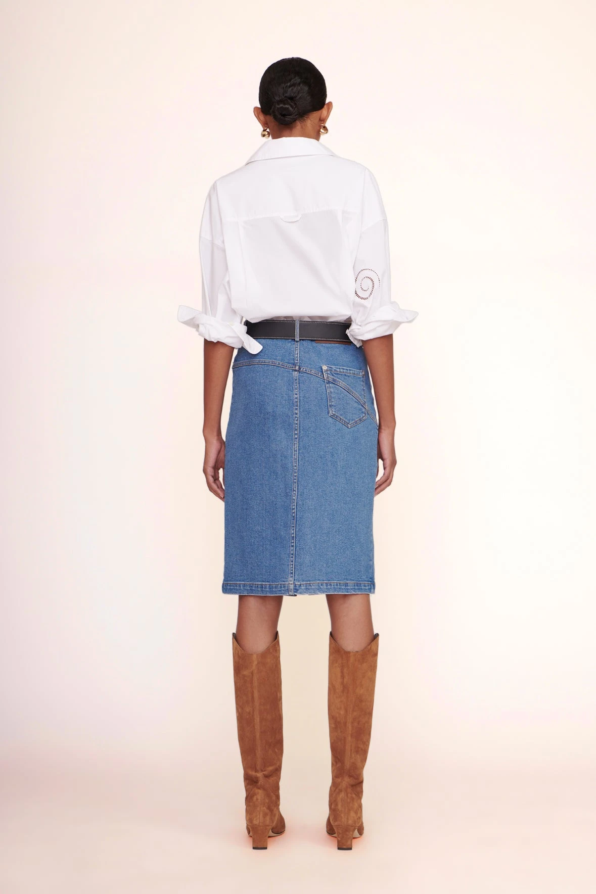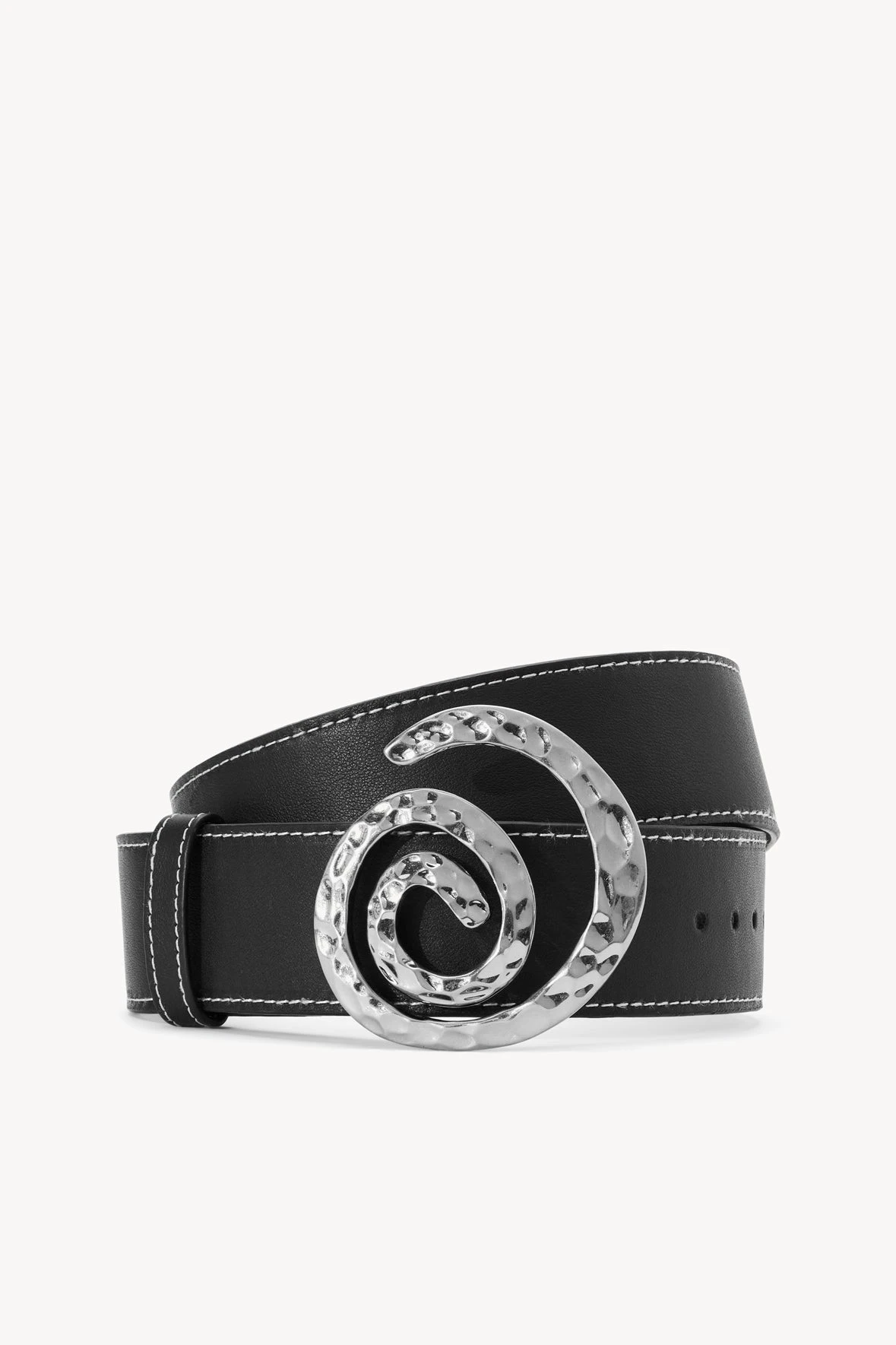 A 45mm leather belt with contrast top stitch. This style features a hammered prong buckle with swirl motif that matches our ready to wear collection.
