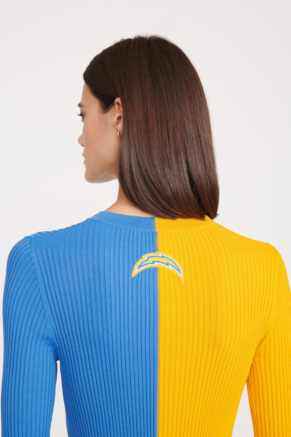 Our favorite cardigan, the Cargo Sweater, is updated to support your favorite NFL teams. The NFL STAUD Cargo Sweater is made out of our stretchy, comfortable compact rib knit fabric, and can be worn buttoned or unbuttoned. This special capsule features our signature color blocked pattern and a NFL team logo on the back.