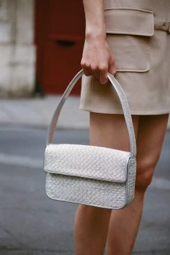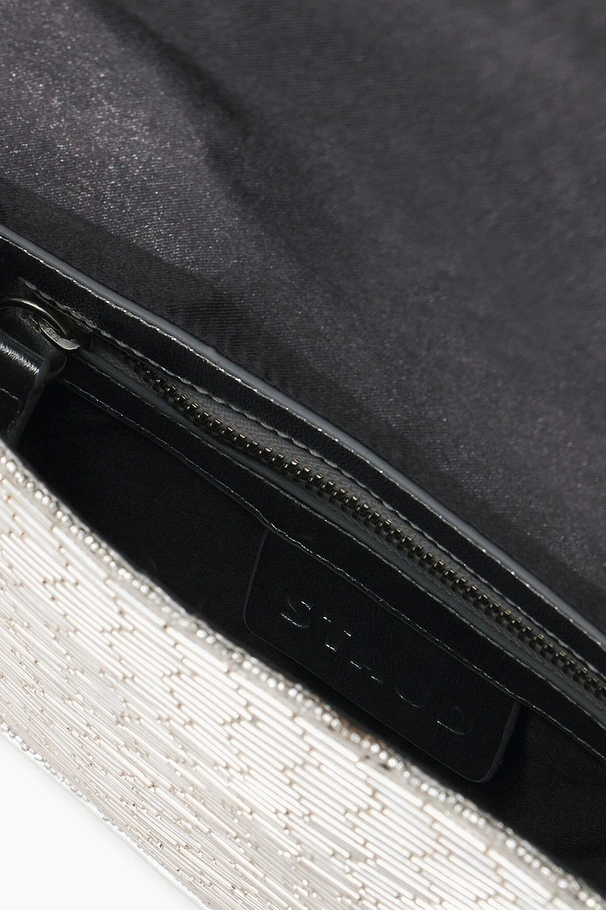 The new Tommy for Fall. The classic hand-beaded shoulder bag with vegan leather piping. This Tommy update features an all over monochromatic bugle bead design with a magnetic snap closure.