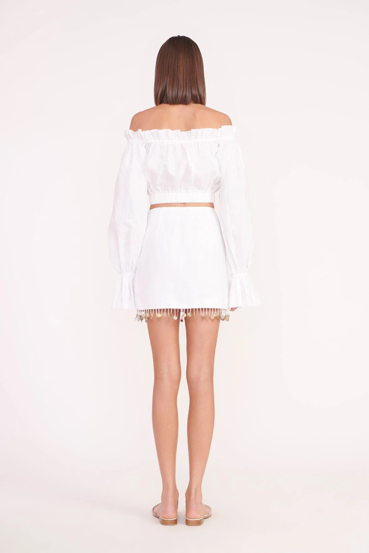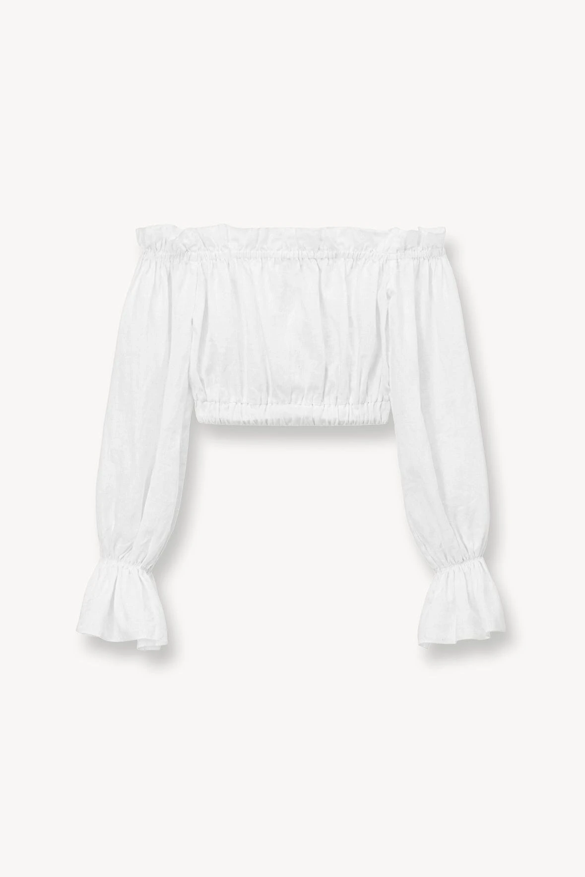 The Tristan Top is a cropped linen top, perfect for your Summer wardrobe. This top features an off the shoulder neckline, with ruffles at the neckline and cuff, with an elastic hem.Â