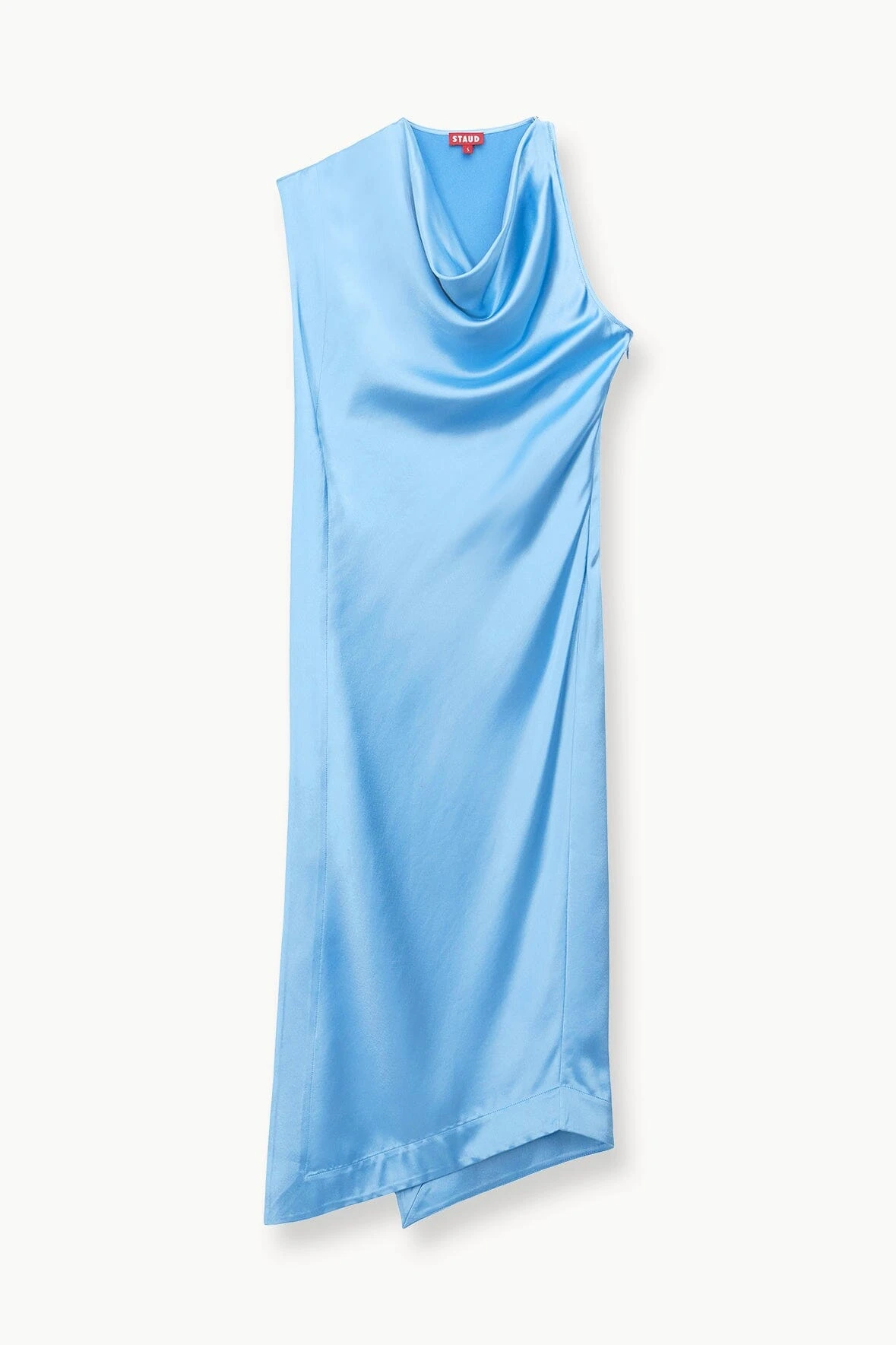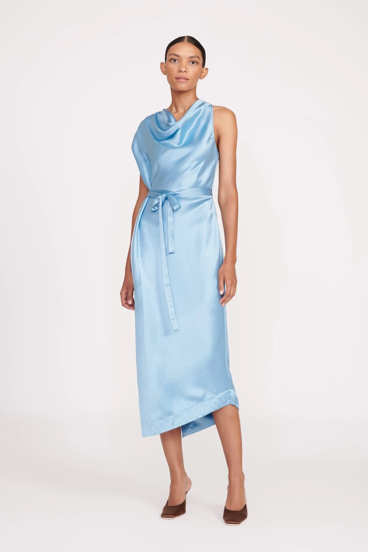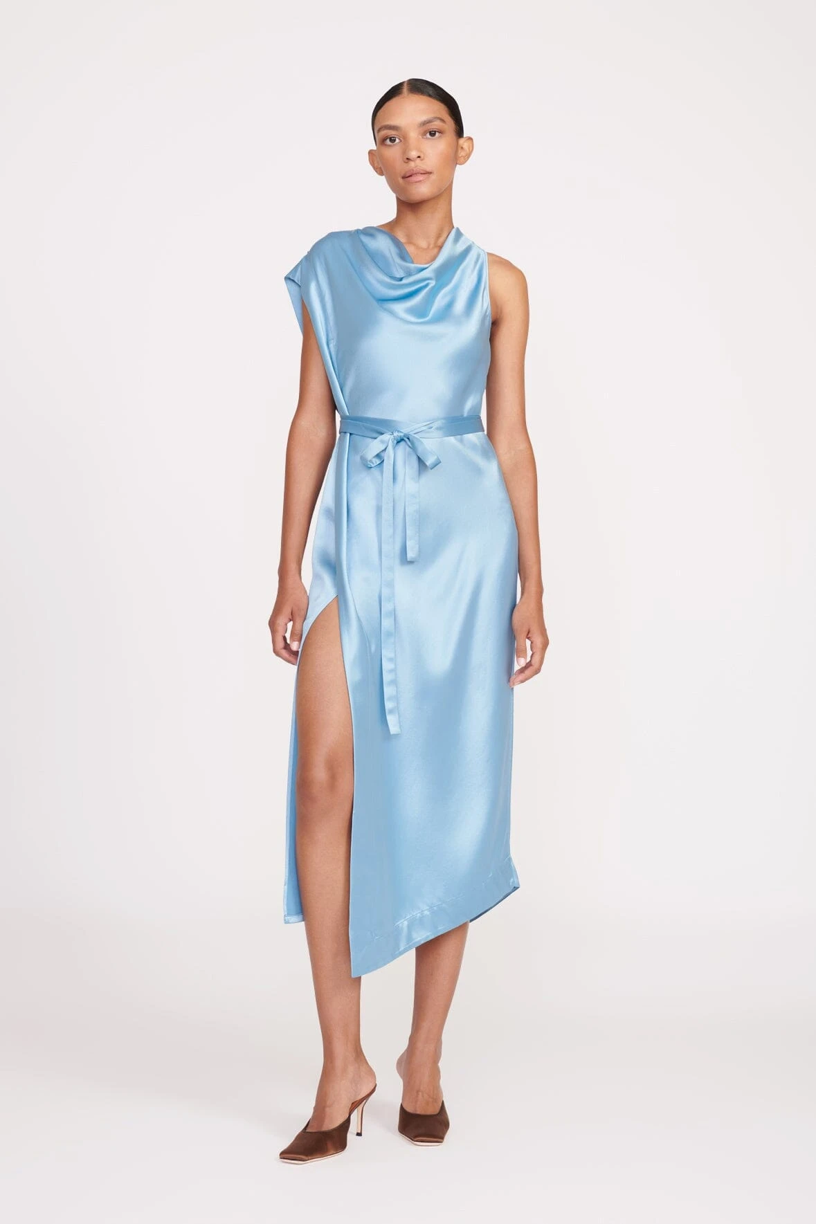 An asymmetrical midi dress crafted from a satin fabric, the Troupe features a cowl neck, tie at the waist, and thigh-high slit.