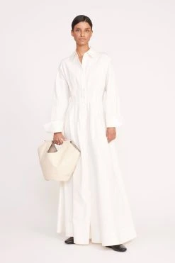 A chic button-up dress with a collar and oversized cuffs that can be worn buttoned or rolled up for an exaggerated look; The Winona Dress features a cinched waist with a comfortable elastic waistband at the back and is crafted in grosgrain.Â
